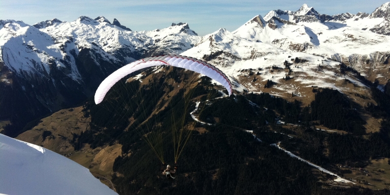 You can use the top quality durable 27g/m² fabric (70000 E71A) and the 12mm wide riser, that is easy to hold, along with the 0.6 mm top line, to reduce the BLUE MT’s weight by 30 % so that it weighs only 3.5 kg (from size) when launching. To save even more weight you can use TEAM FIVE’s GREY MT (harness). It only weighs 3.1 kg and is available with an airbag.